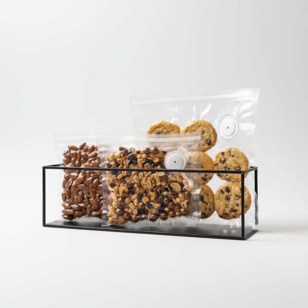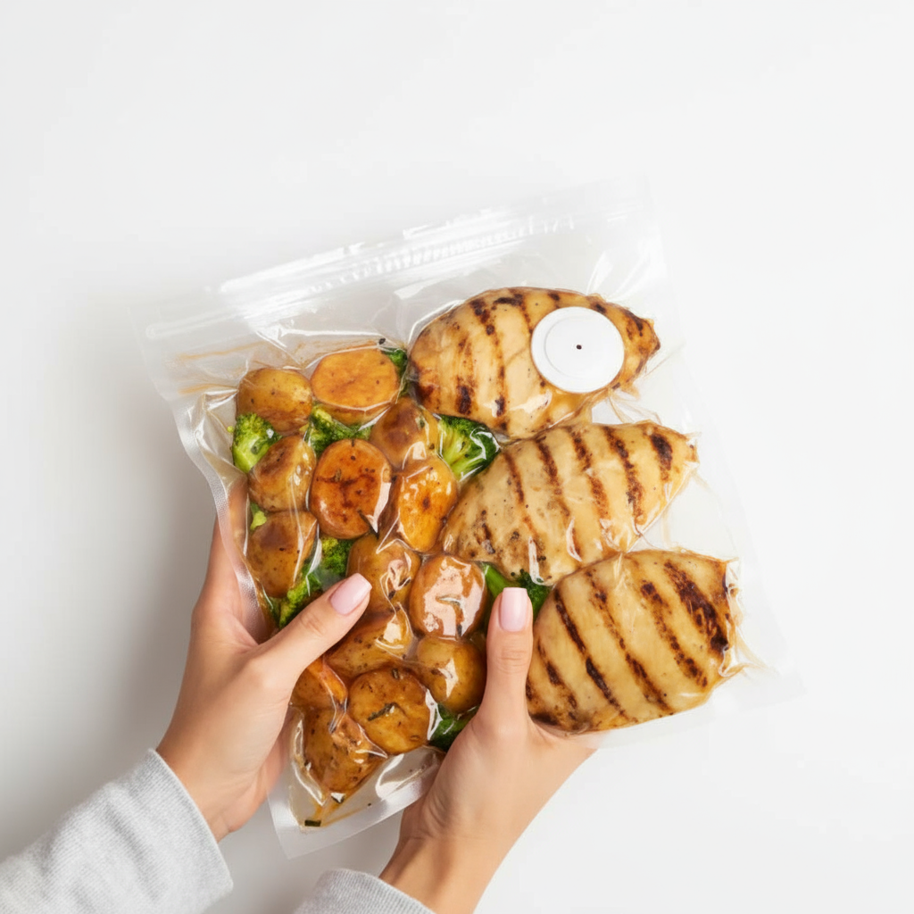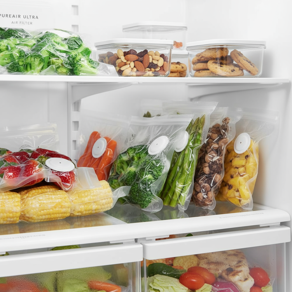 Det smarte vakuum-system fjerner ilt og forsegler maden helt tæt, så både smag, saft og næringsstoffer bevares. Perfekt til kød, grøntsager, frugt og rester – både i køleskab og fryser.